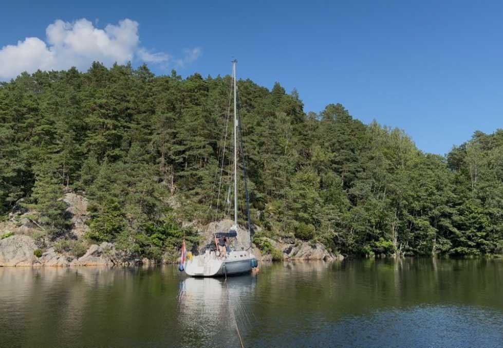 In Mandal haalden we advies bij de havenmeester en locals. We wilden richting het westen, maar iedereen raadde dat af vanwege het beruchte slechte weer daar. Dus trokken we oostwaarts. Zonder vast plan voeren we een willekeurige fjord in en vonden een droom van een ankerplek. Met een lijn vastgemaakt aan een boom op de wal lagen we veilig, zodat we ’s nachts niet konden draaien en schade oplopen aan het roer.