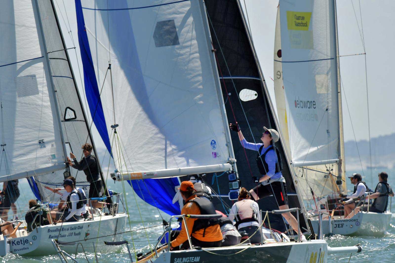 Dan dag twee; Na het ontbijt, verse broodjes door Mathieu gehaald, nemen we de regels samen nog even door. We finetunen de boot nadat ze op de trailer naar Nieuwpoort is gereden, te water is gelaten en de mast is gezet, daarna volgt de practice race. We eindigen net achter het midden, 41e. We hoopten net ietsje beter dan dat, maar zijn tevreden voor nu. Free Belgian Waffle in de tent voor iedereen, dat gaat er wel in. Mathieu, Willemijn, Wessel en vriendin Julie rijden na een heerlijk door Femke bereid maal weer terug naar Willemstad, Anne blijft de hele week in Nieuwpoort en we melden haar aan als reserve bemanning, mocht er iemand een uitvaller hebben! We zien Mathieu met de broodjes, en onzelf met onze te leuke team shirts, nog de hele week op het grote scherm in The Race Village voorbij komen, alsof hij nooit vertrokken is.