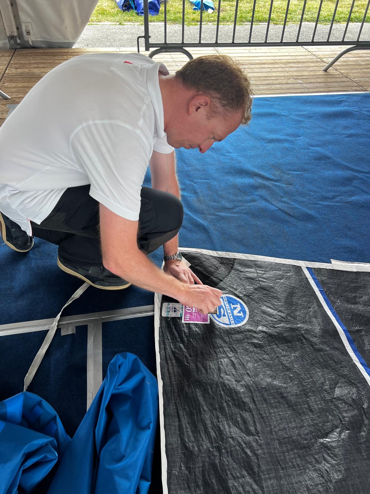 Hij begon op 5 juli 2025 met meten en wegen. Eerst de bemanning: met zijn vijven onder de 350kg blijven, we houden nog 7kg over, yes stap 1 . Dan de zeilen; één voor één worden ze uitgelegd op de vloer en van begin tot eind gemeten om uiteindelijk met een handtekening over de sticker van de eenheidsklasse goedgekeurd te worden. Ook hier komen we goed doorheen . Dan de boot nog, even aan de weegschaal hangen en ook hier geen op- of aanmerkingen . We sluiten dag 1 met een bubbel af 🍾, we mogen meedoen! We bedanken Paul voor al zijn inzet met een heuse ooJee vlag met de welbekende smiley’s, die wordt zsm in de ooDee (een van onze twee moederschepen) gehesen en zal de hele week het herkenningspunt van ons kamp zijn 😀😀J😀😀. Dan hup naar de Openings Ceremonie, Haute Dog, en free Duvel 🍻.